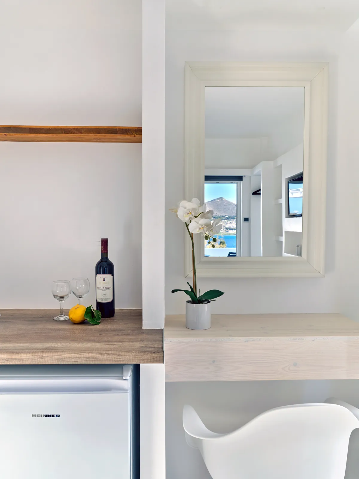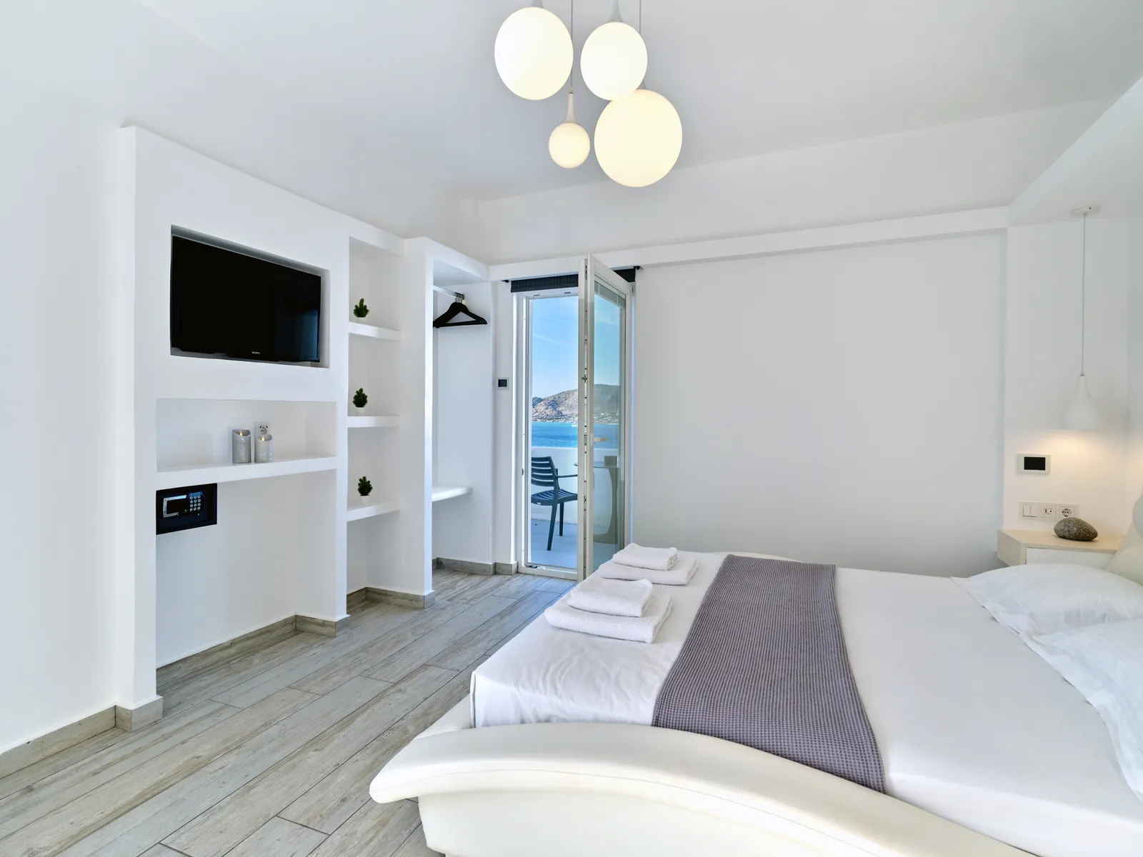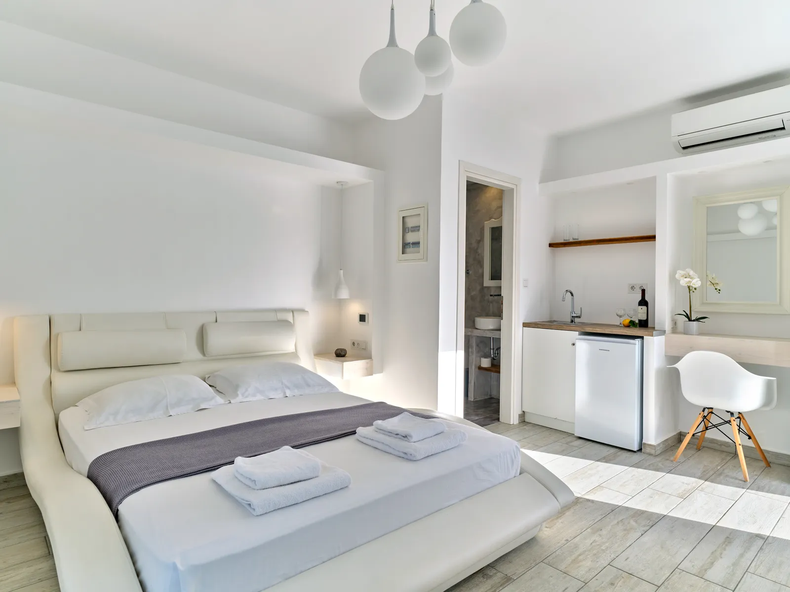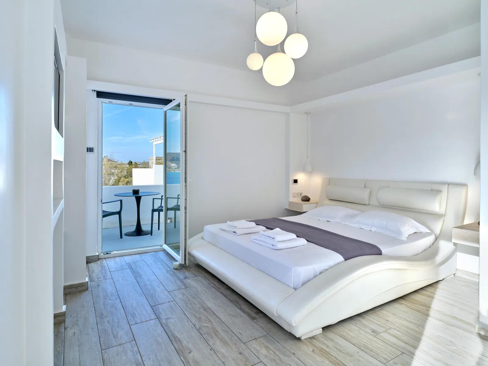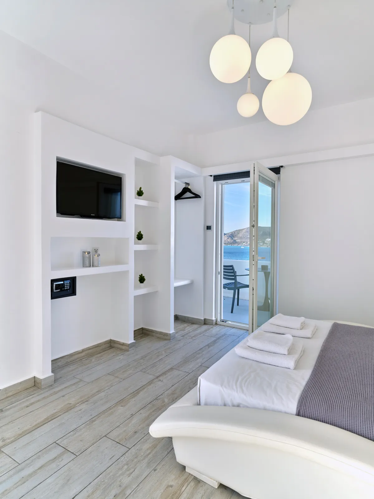 Privileged with the astonishing view of Naousa Bay, along with the swimming pool and their private balcony, rooms therefore acquire their own character from the decoration's white tint.
