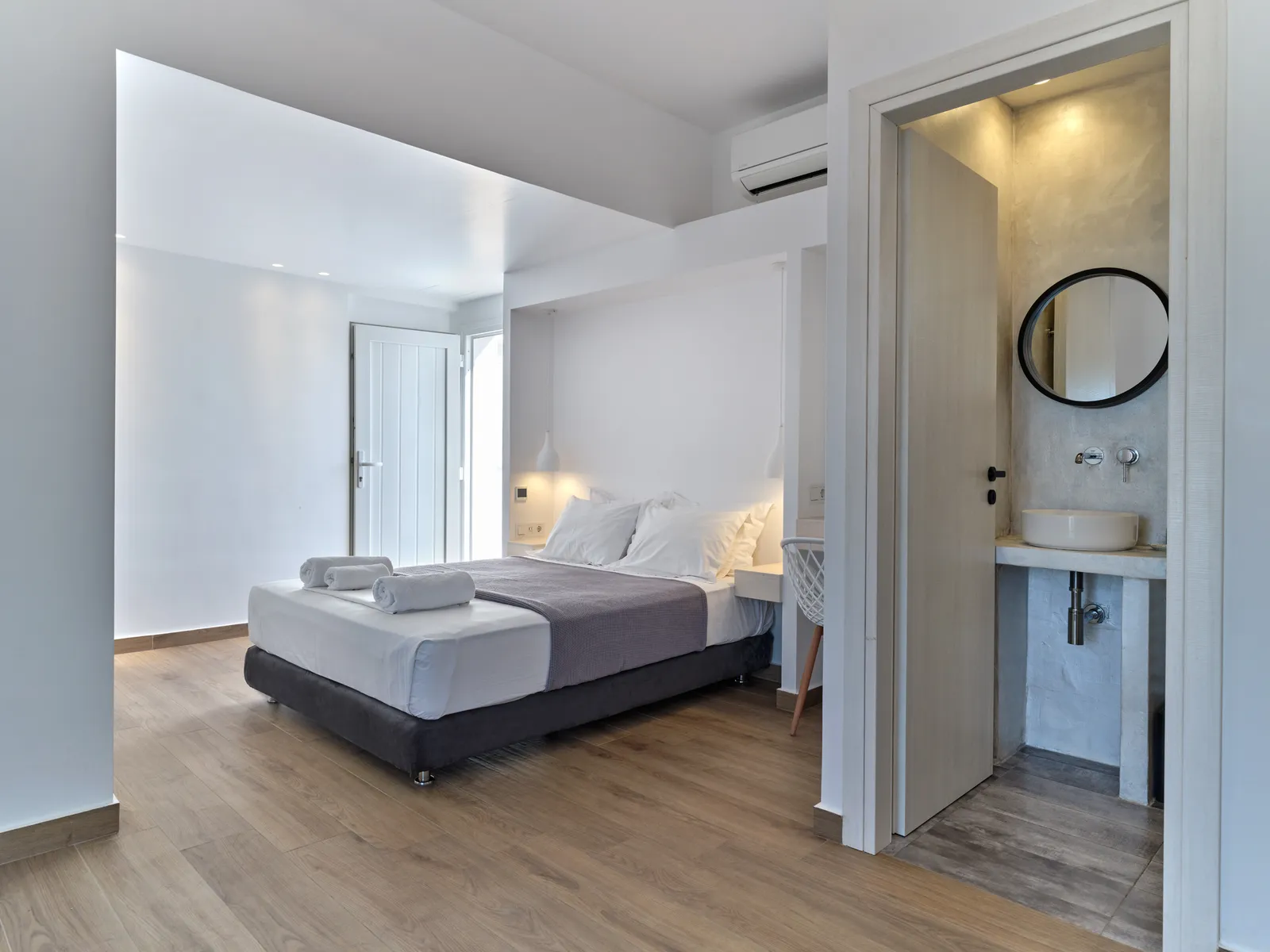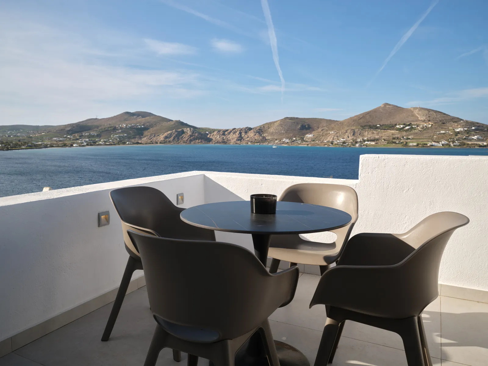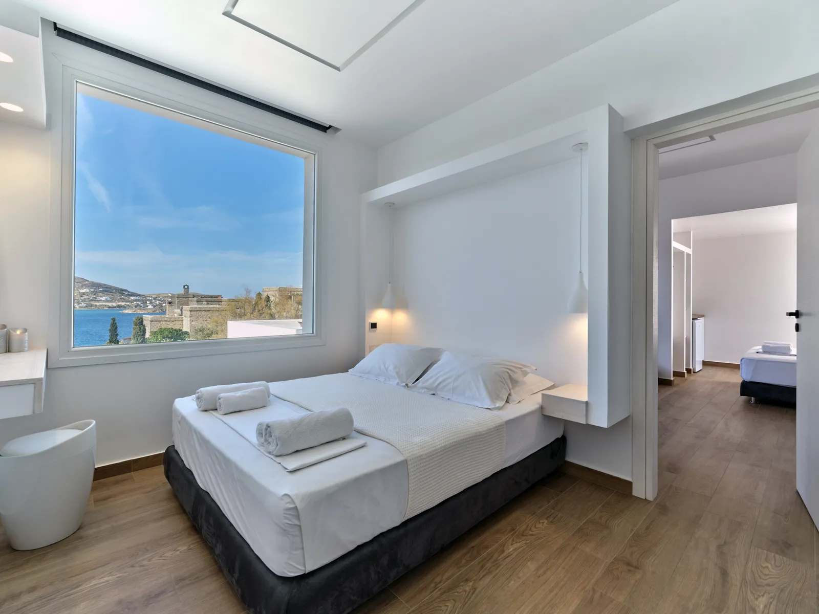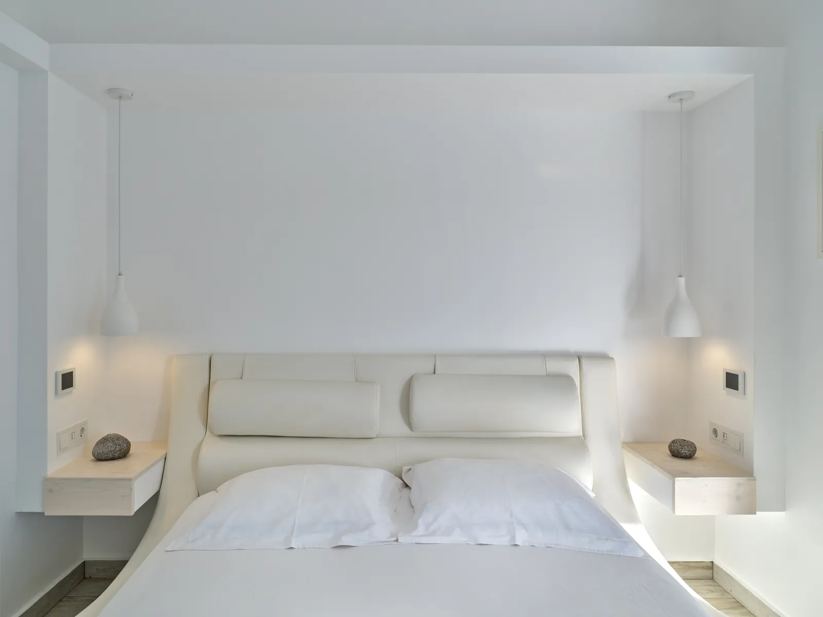 Privileged with the astonishing view of Naousa Bay, along with the swimming pool and their private balcony, rooms therefore acquire their own character from the decoration's white tint.
