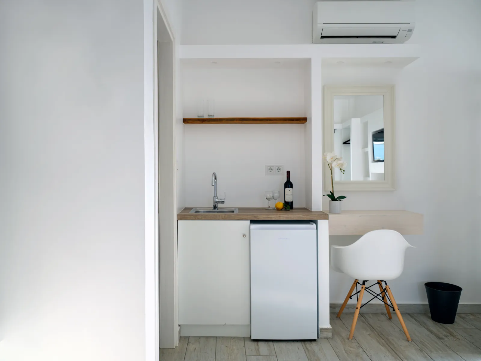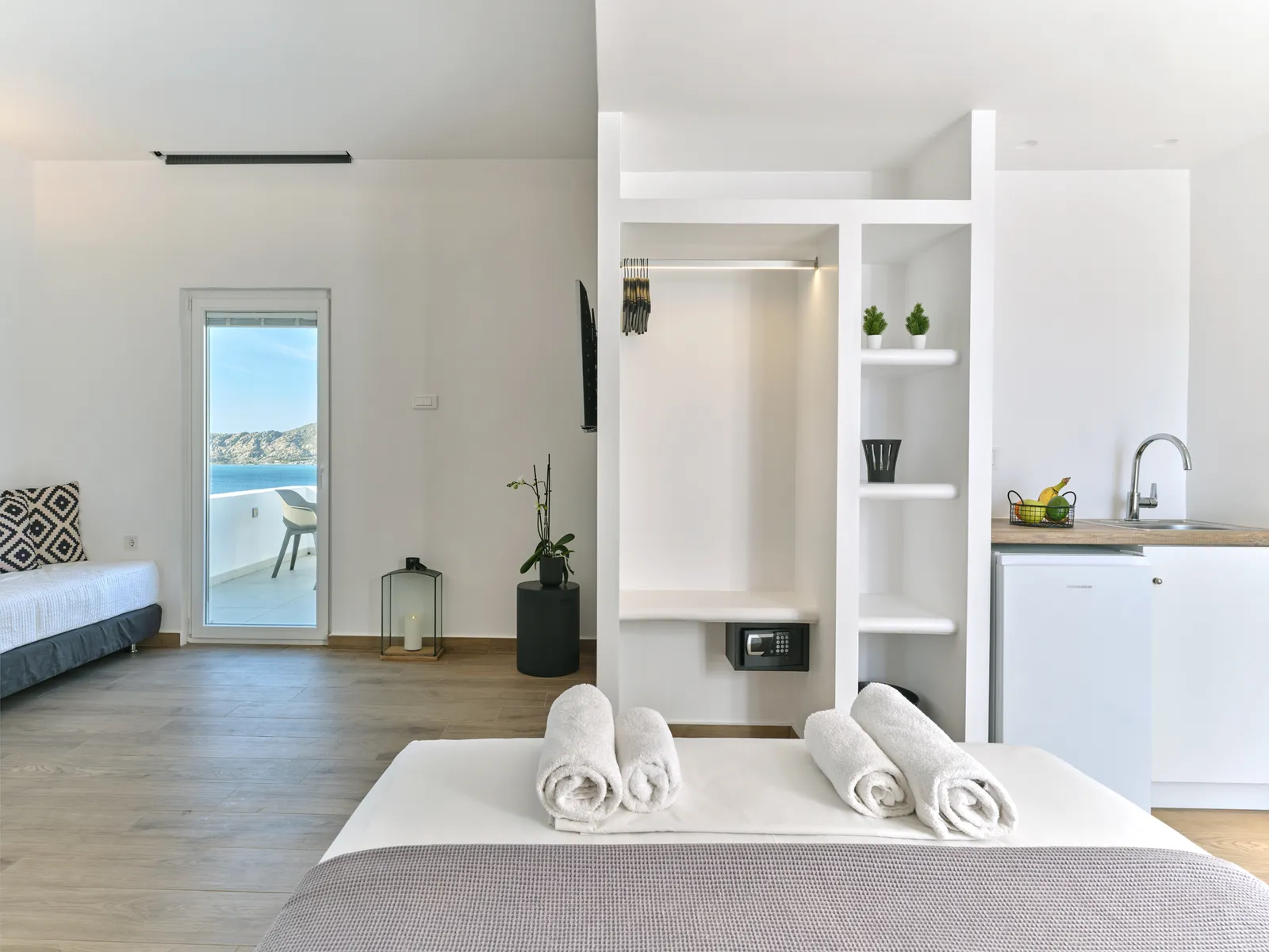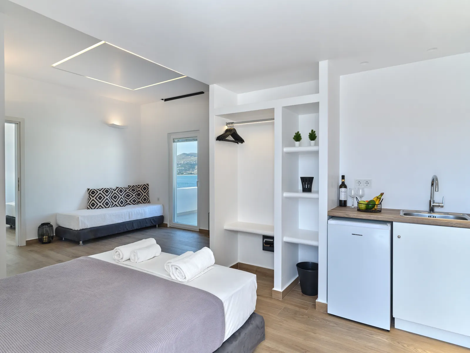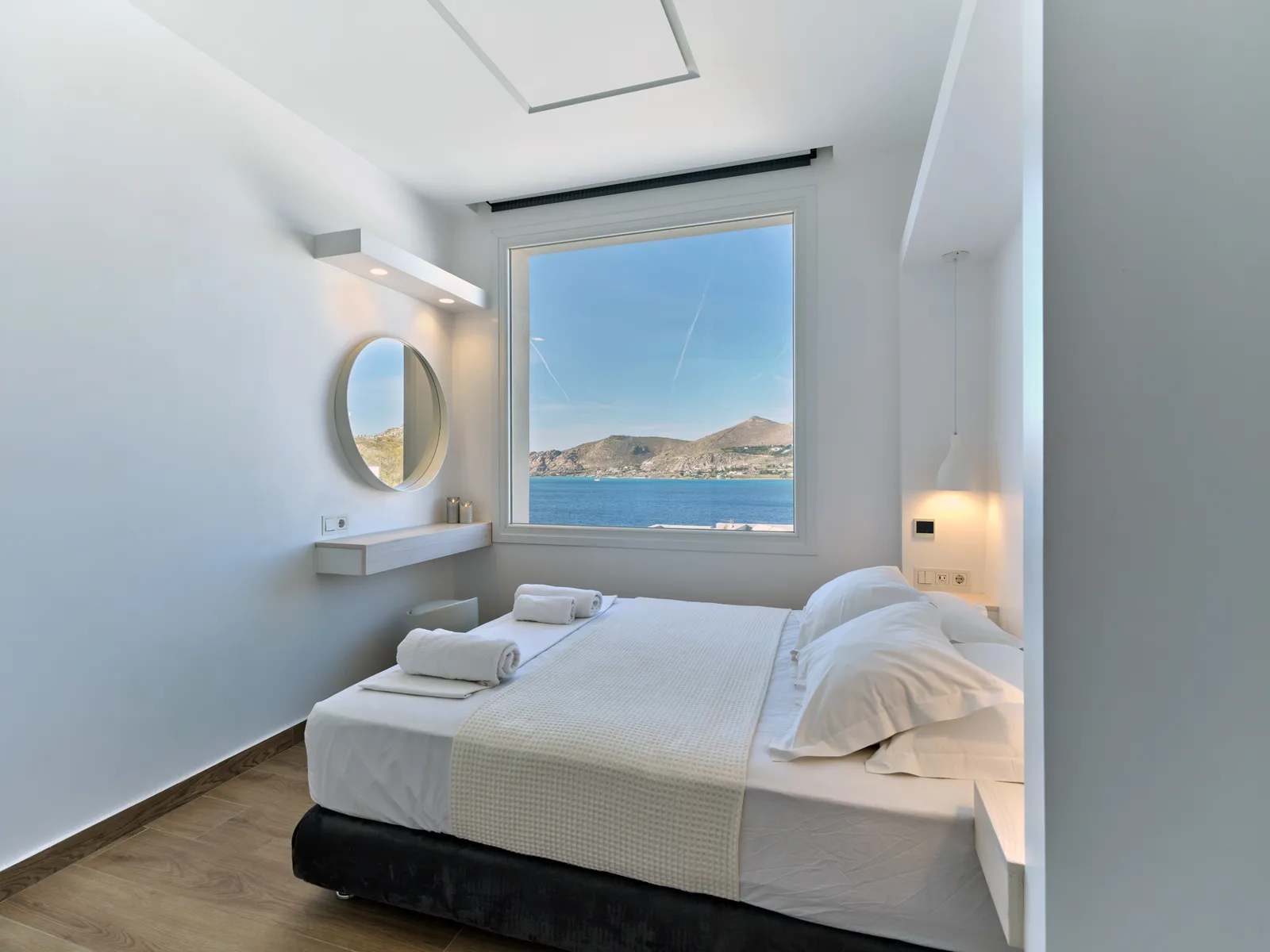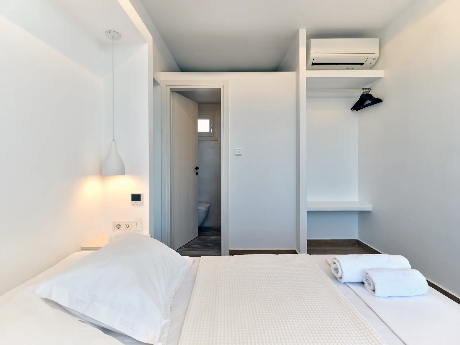 Privileged with the astonishing view of Naousa Bay, along with the swimming pool and their private balcony, rooms therefore acquire their own character from the decoration's white tint.