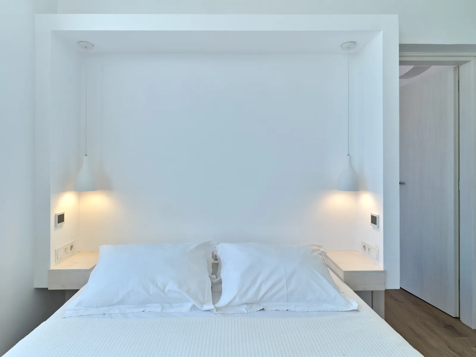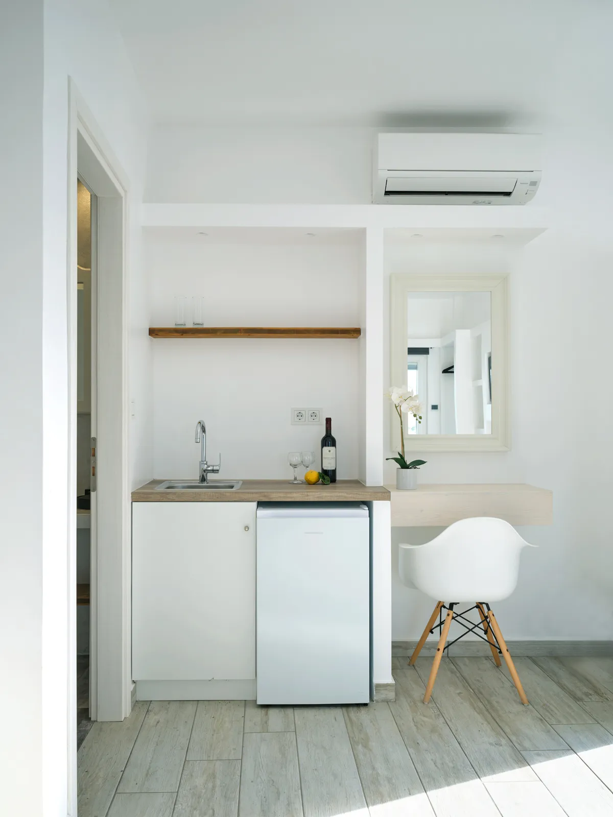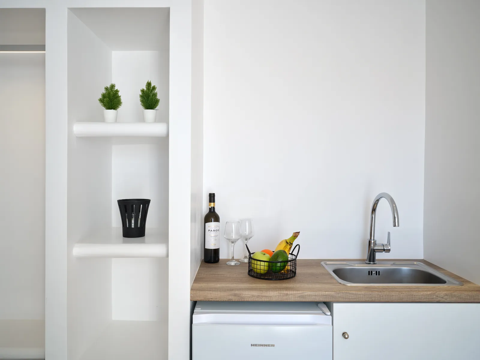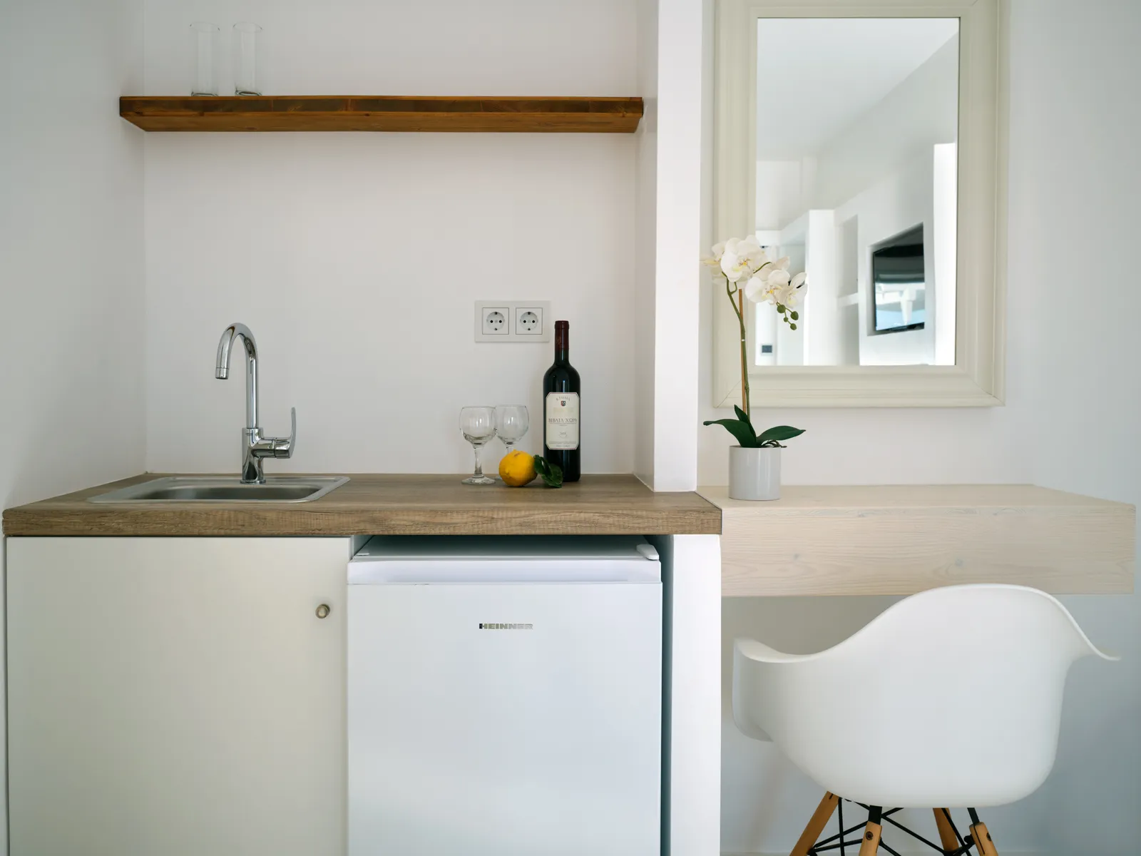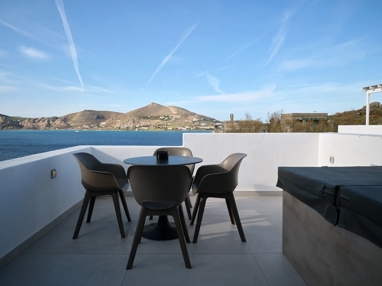 Privileged with the astonishing view of Naousa Bay, along with the swimming pool and their private balcony, rooms therefore acquire their own character from the decoration's white tint.